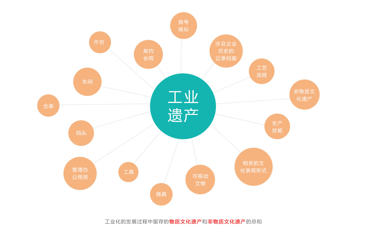 “凡为工业活动所造建筑与结构、此类建筑与结构中所含工艺和工具以及这类建筑与结构所处城镇与景观、以及其所有其他物质和非物质表现,均具备至关重要的意义……工业遗产包括具有历史、技术、社会、建筑或科学价值的工业文化遗迹,包括建筑和机械,厂房,生产作坊和工厂矿场以及加工提炼遗址,仓库货栈,生产、转换和使用的场所,交通运输及其基础设施以及用于住所、宗教崇拜或教育等和工业相关的社会活动场所。”